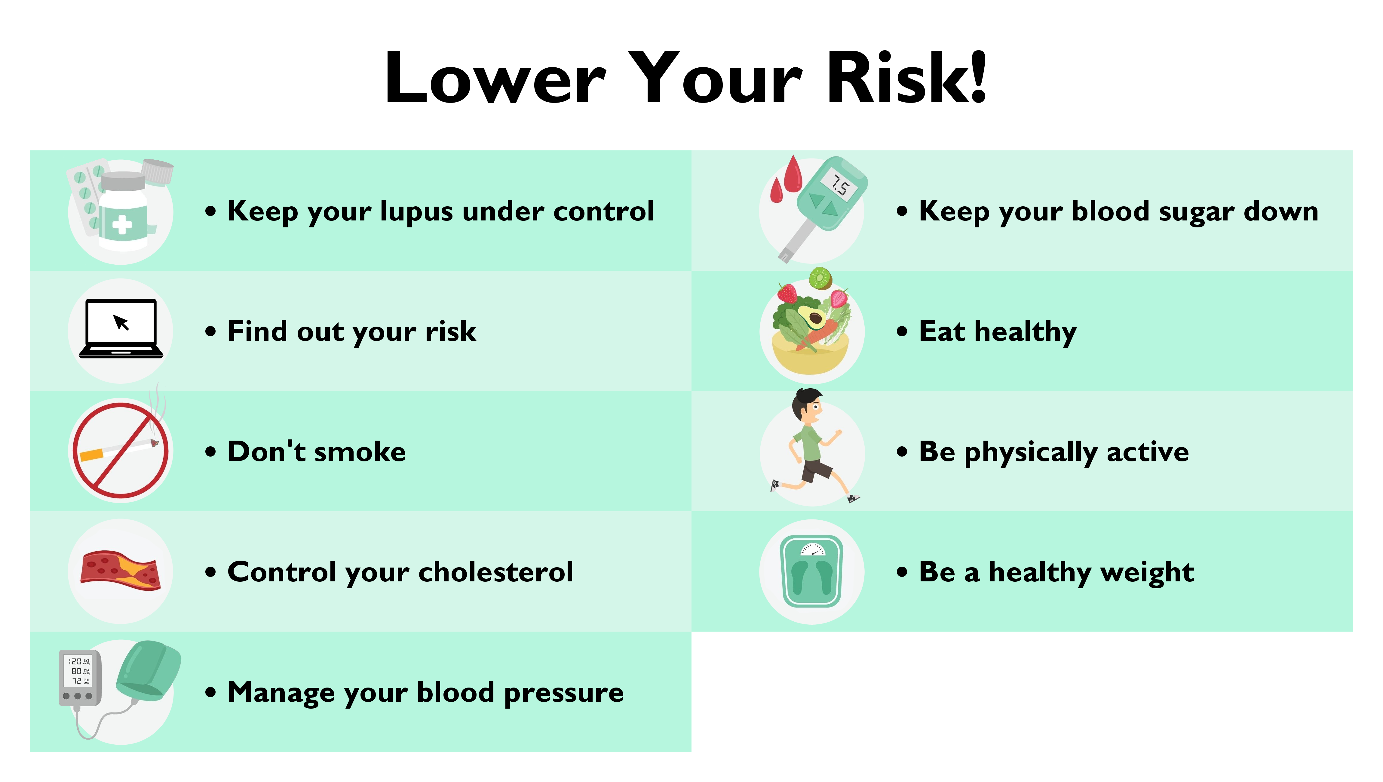 According to current literature and published guidelines by national health committees including the American College of Rheumatology (ACR), American College of Cardiology/American Heart Association (ACC/AHA), and the European Alliance of Associations for Rheumatology (EULAR), there are three main steps to improve cardiovascular disease (CVD) risk in patients with systemic lupus erythematosus (SLE):1